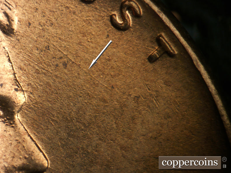 E/W die scratches cover most of reverse, see photos for exact configuration. A small heavier die scratch below the center of the base. Die depression in O of ONE. Reverse is MDS.