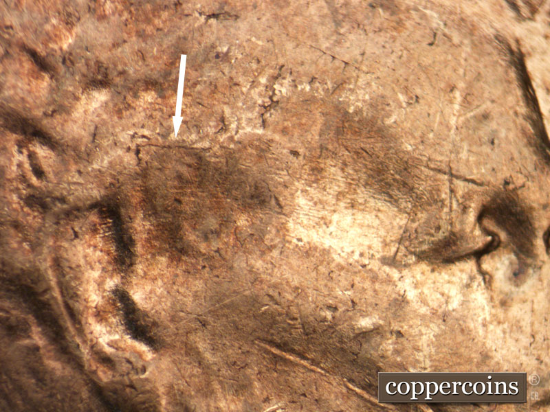 Generally N/S die scratch from jacket up next to 1 in date. Worn concentric die scratches on jack between lapel and shoulder. Short N/S die scratch behind neck. Short die crack NE of top of ear. Reverse is LMDS