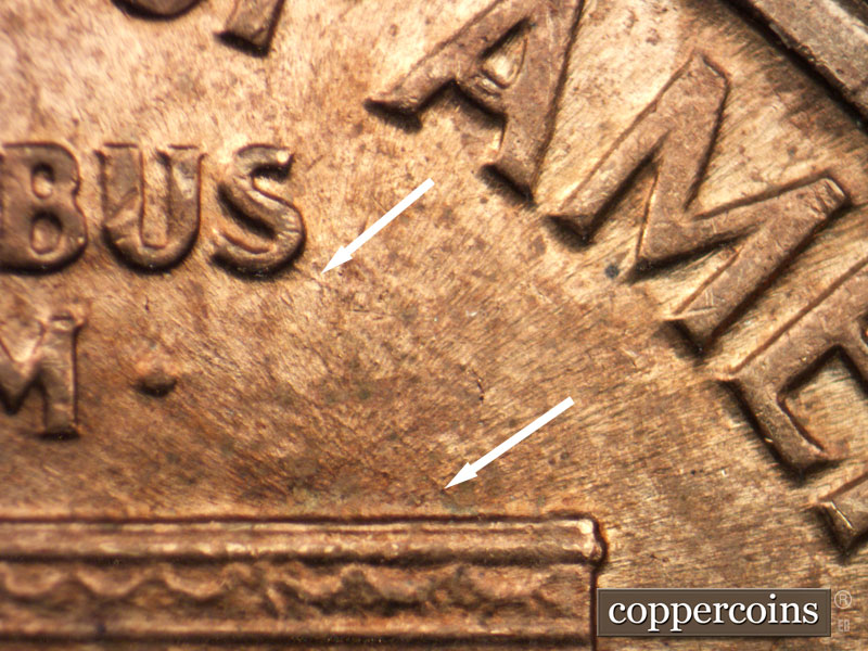 SW die scratch from top of E in EPLURIBUS. SE die scratch from S in PLURIBUS. Die pitting between NE in ONE