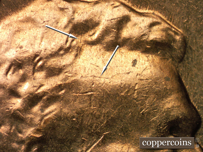 NNE die scratch just east of Y in LIBERTY. NNE die scratches on neck. Die crack on forehead. N/S die scratches in hair. Die scratches from nose and forehead. Die gouge by rim east of 9 in date. Reverse is MDS.
