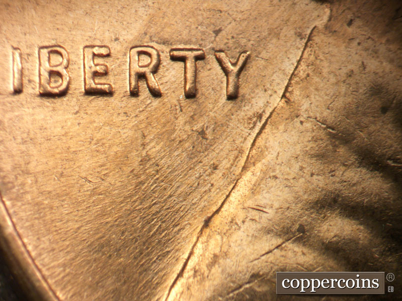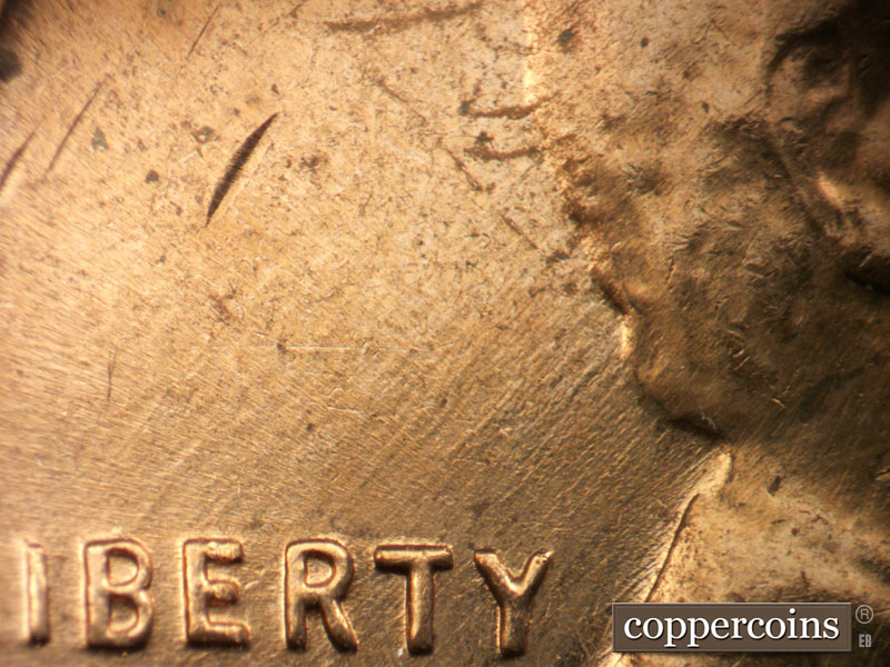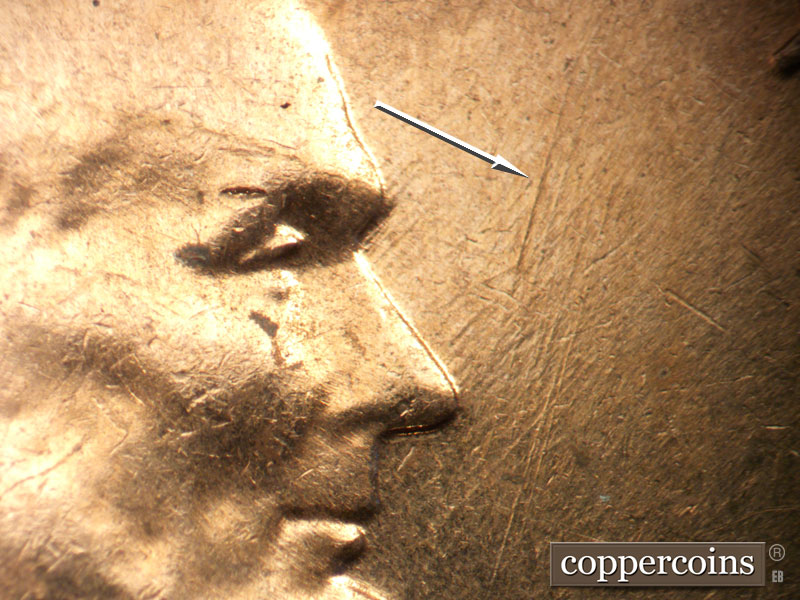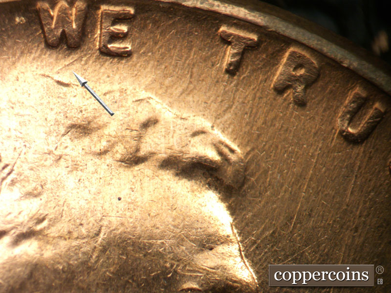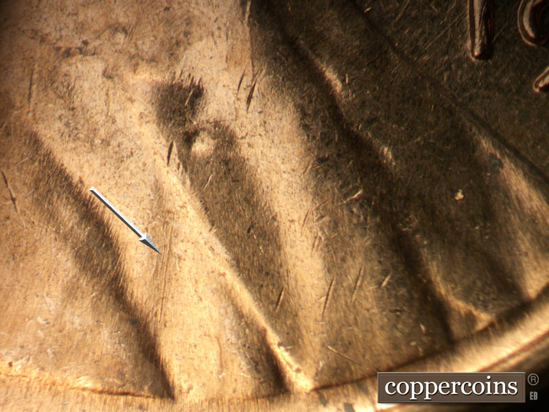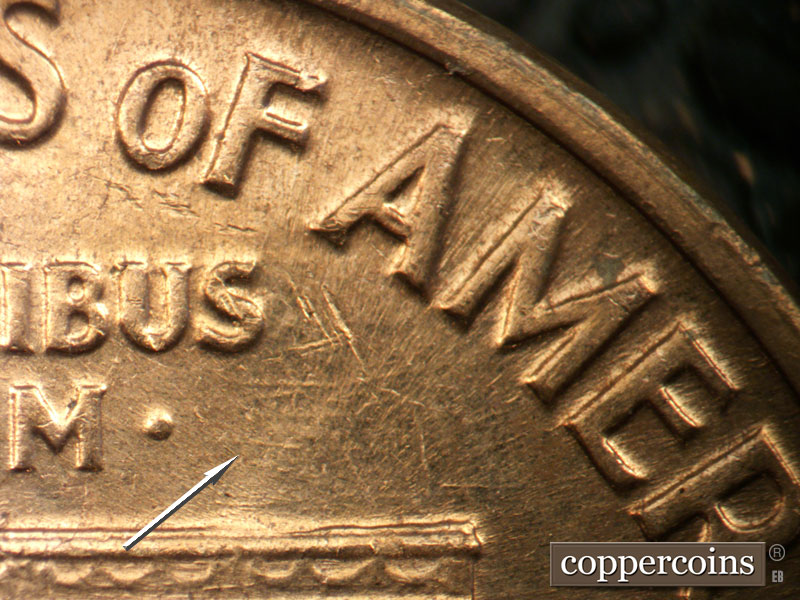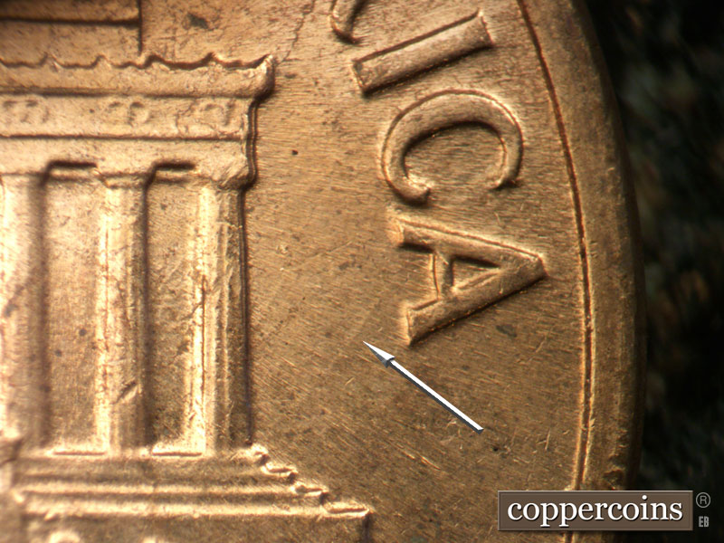 Unique die scratches above left cornice. E/W die scratches above roof, remnents of a die clash under scratches. SW die scratch west of last A in AMERICA