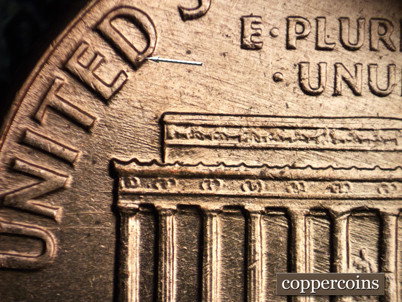Numerous NW-SE die scratches throughout the reverse. A small die break is seen on D in UNITED and T in CENT. A large die blob shows on the lower left memorial base. Evidence of a die clash shows in the 8th memorial bay.