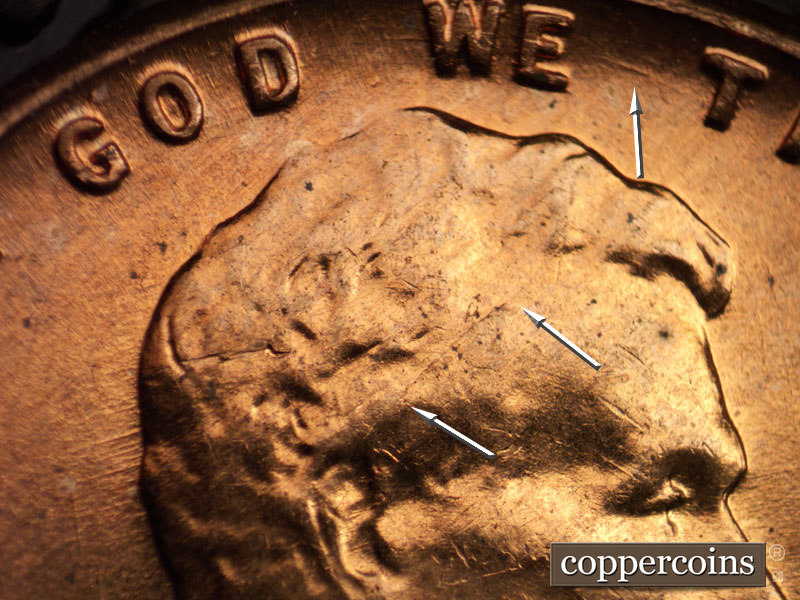 Light E/W die scratches through date and from bowtie area. No die break on lower R in LIBERTY. Short ESE die scratches from back of head Concentric die scratches on lapel and jacket. Reverse is EDS