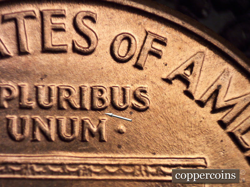 Small die chip on left base. 2 die dots behind E in CENT. Small die gouge from bottom of B in PLURIBUS. Die dot in bay 3.