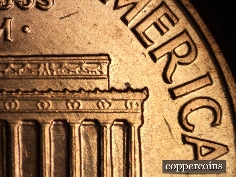 (First Reverse die)Die scratches north from the 2nd vertical bar of the N in Cent. Heavy die scratches in the 10th memorial bay. Multiple die scratches through OF.