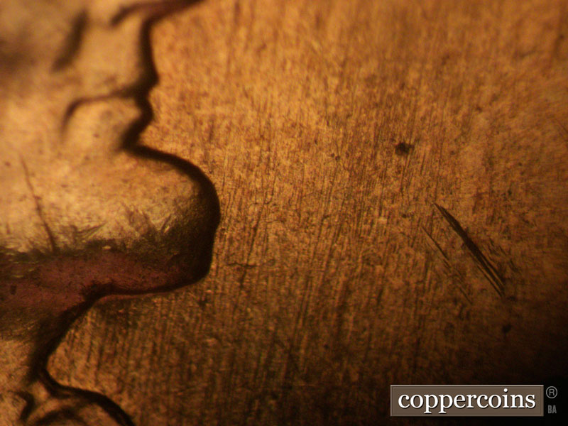 heavy NE-SW die scratches about the entire obverse, heavy gouge behind shoulder Reverse