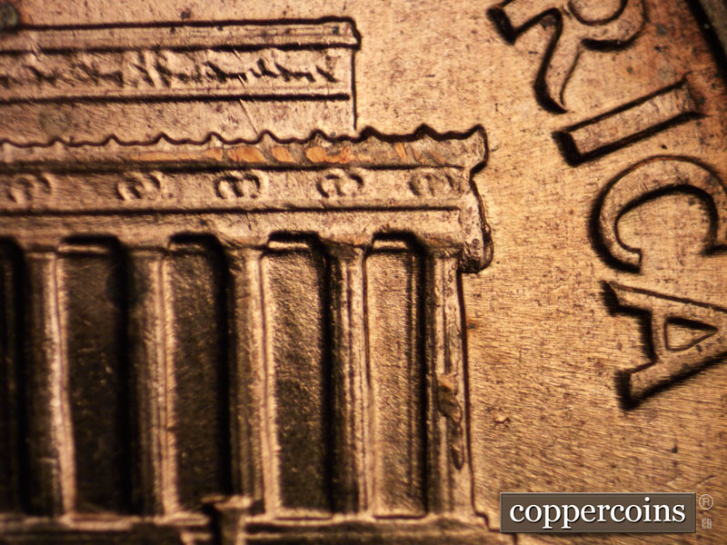 SE die scratches between S in PLURIBUS and roof. Die break at right cornice heading down column 12. ENE die gouge from left side of C in CENT.