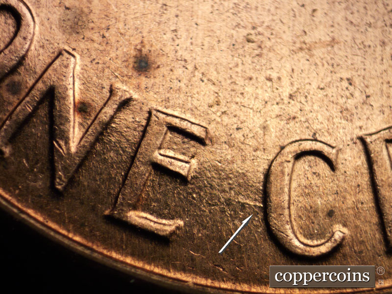 Nearly horizontal die scratches are seen through CENT