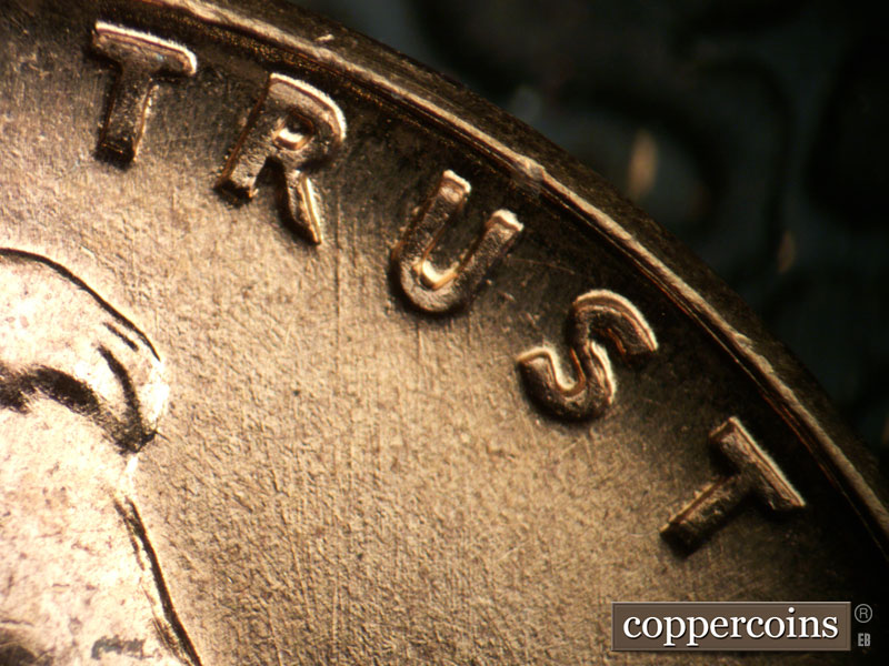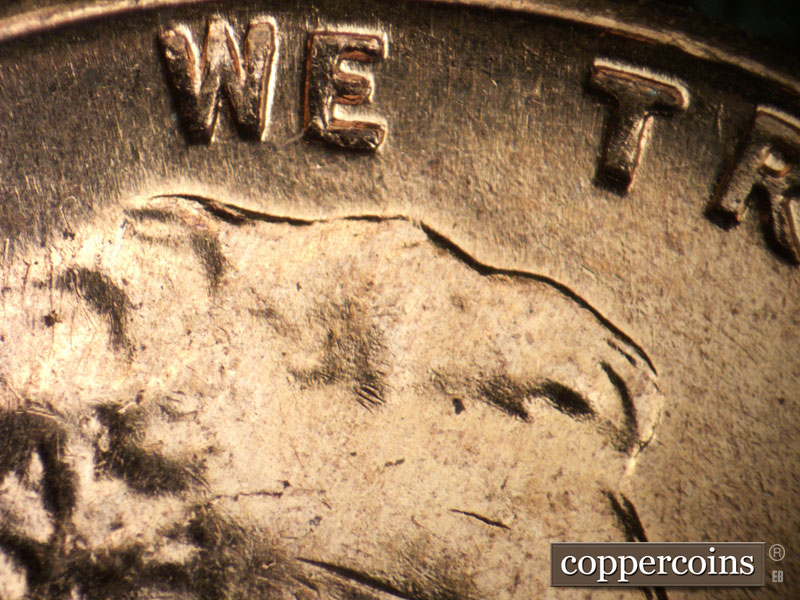 New heavy N-S die scratches show beneath IN GOD. The other die scratches from MDS still show but are worn. The die crack is a little longer and heavier.