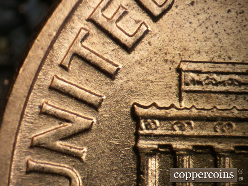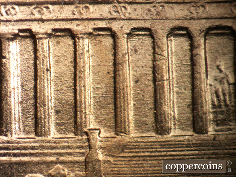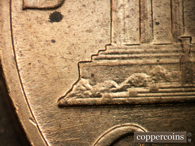 Cncentric die scratches are worn away. A new die scratch runs SE from the first A of AMERICA to the top right cornice top. Another die scratch runs WNW from the left base top. Reverse is LMDS