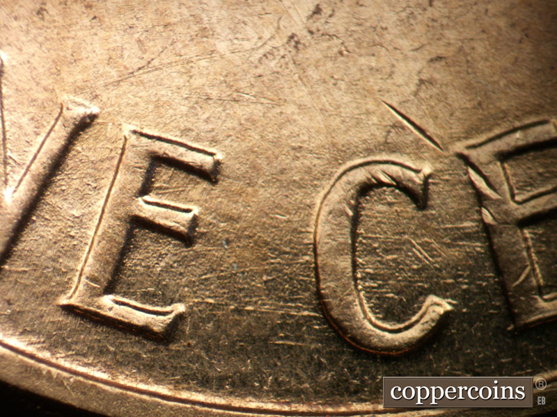 Generally N-S die scratches show on the obverse. A few die scratches running NW-SE show through the date area. A curved die crack extends south from the 1 of the date.
