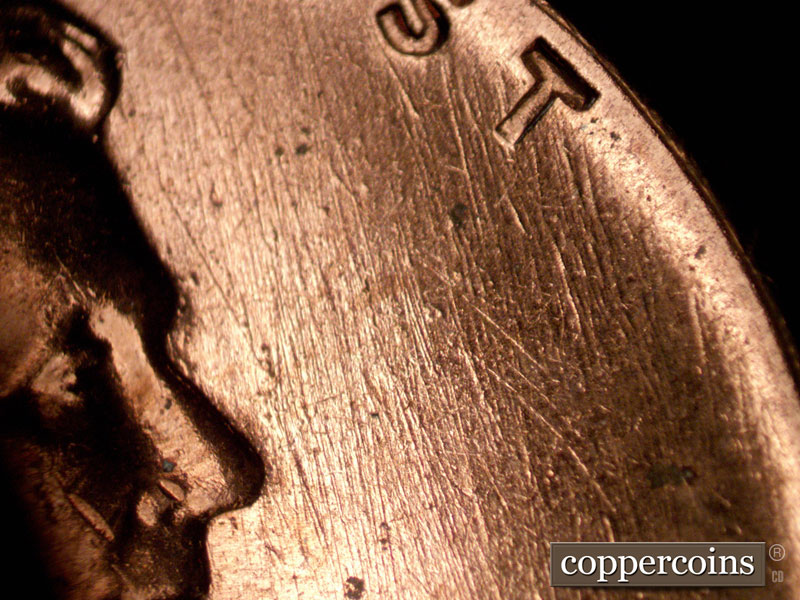 Heavy die clash shows as a raised area running through STATES. WNW-ESE die scratches show behind the Lincoln statue in the center of the memorial. E/W die scratches through EPU. E/W die scratches under base above CENT.