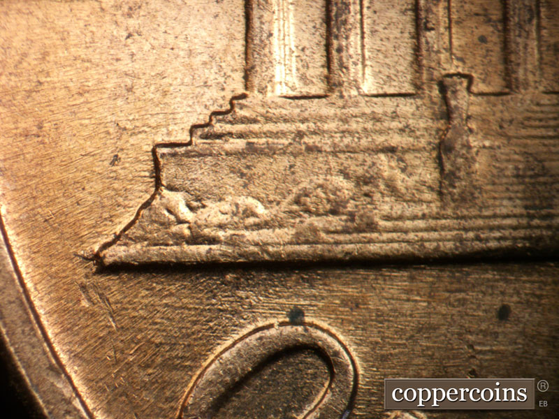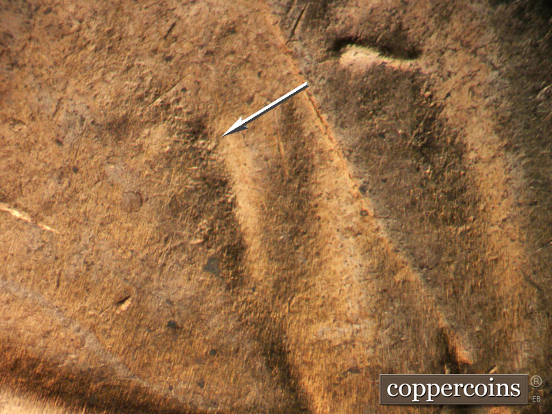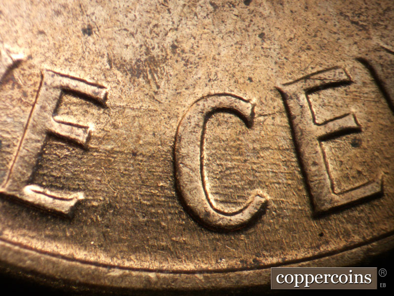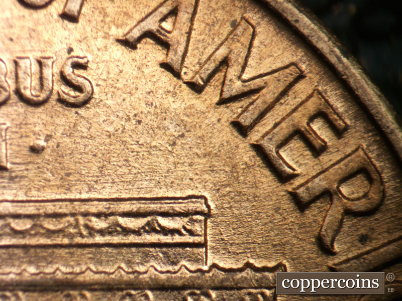 Small die gouges connect NUM in UNUM. ENE die scratch from top of T in CENT. Group of small die gouges between CE in CENT. Die break on left base.