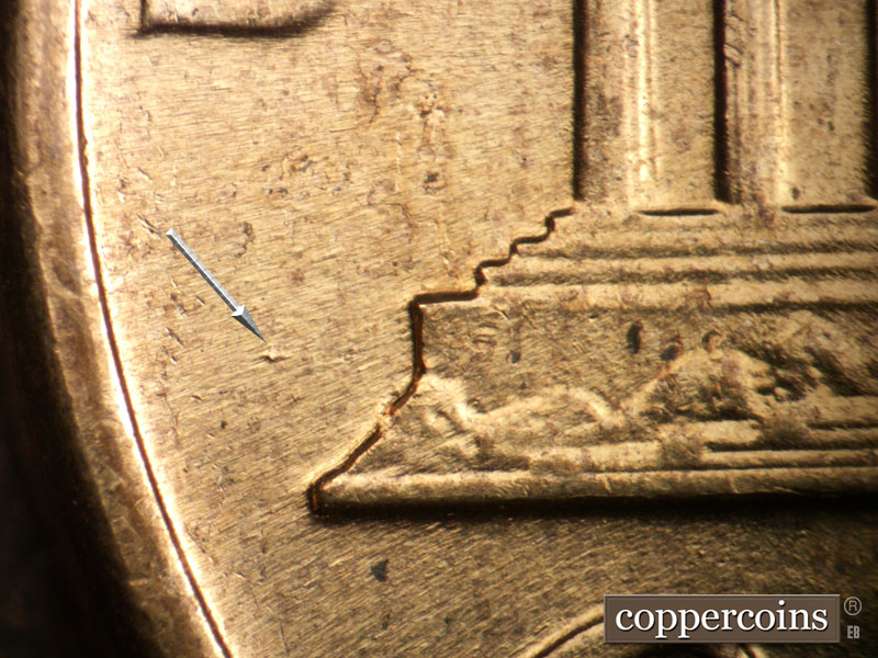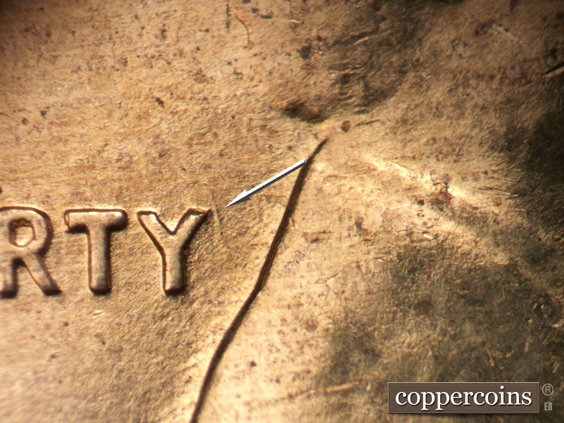 Die scratches to the left of the 1. A long die scratch extends SE from the nose. A die scratch below ER in Liberty.