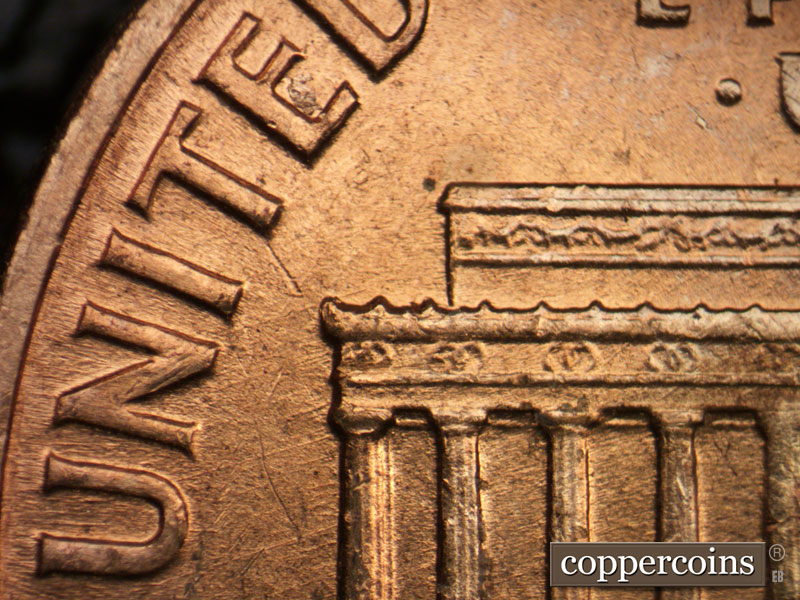SE die scratches from left cornice /column 1 to UNI in UNITED. E/W die scratches through EPU. E/W die scratches in bays 9,10 and 11. Light generally E?W die scratches through CENT. Concentric die scratch from O through N in ONE.