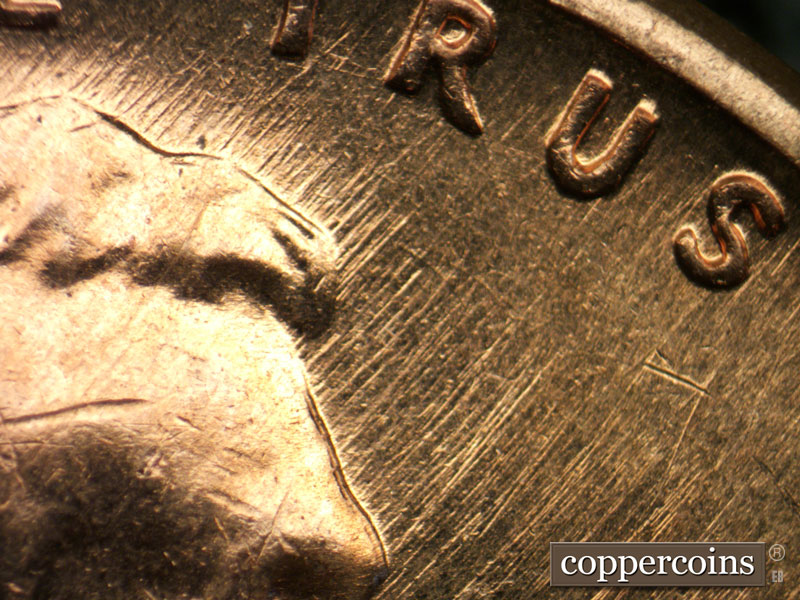 NE/SW die scratches cover obverse, see photos for exact configuration. Short NW die scratch on jacket. E/W die scratches under LIBERTY. Reverse is MDS