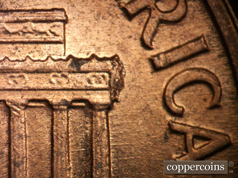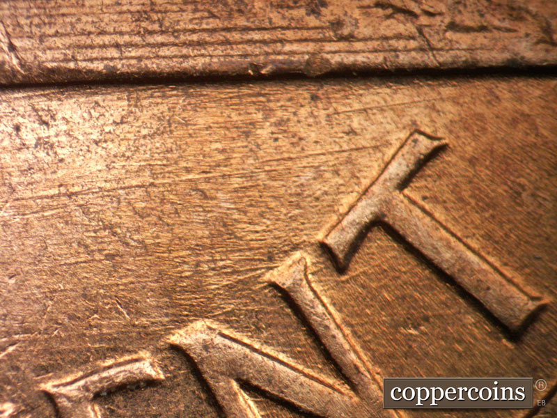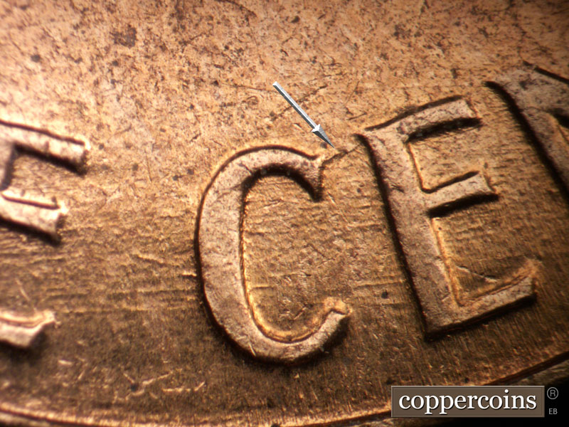 ENE die scratches cover reverse, see photos for exact configuration. Die crack connects CE in CENT. Die chip on right cornice.