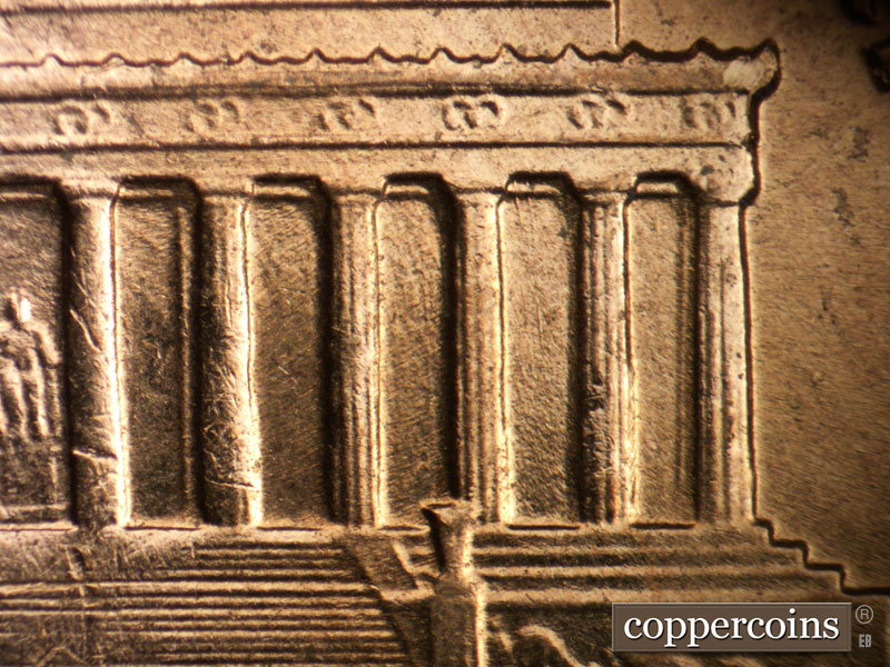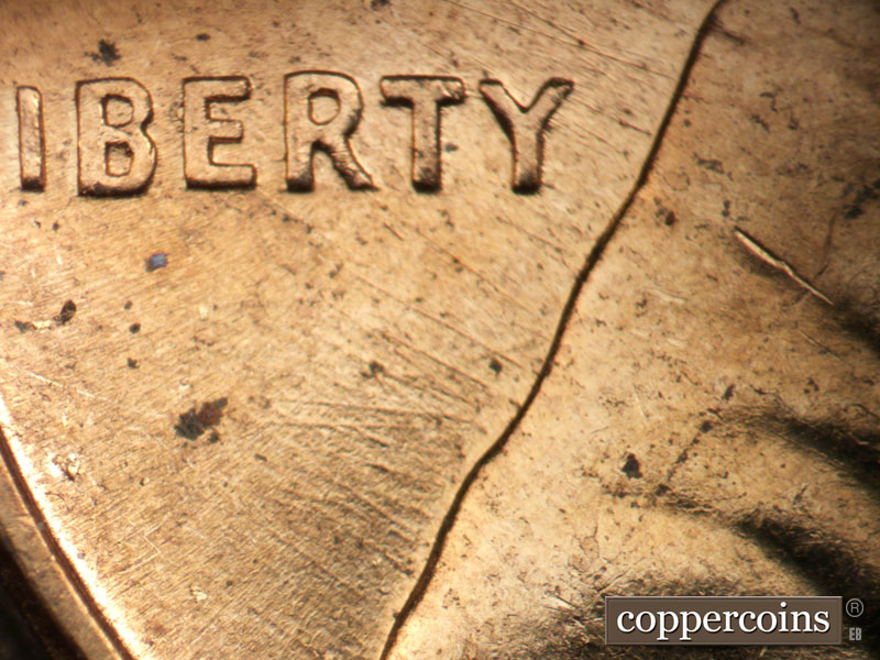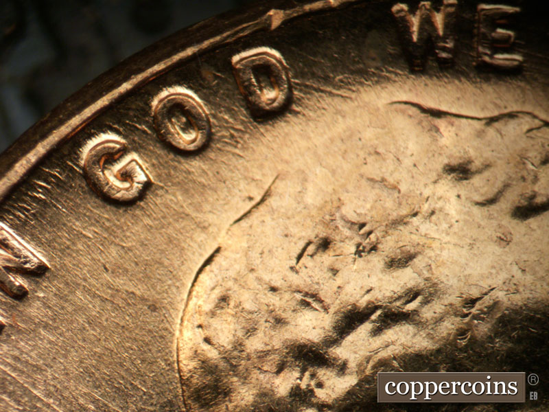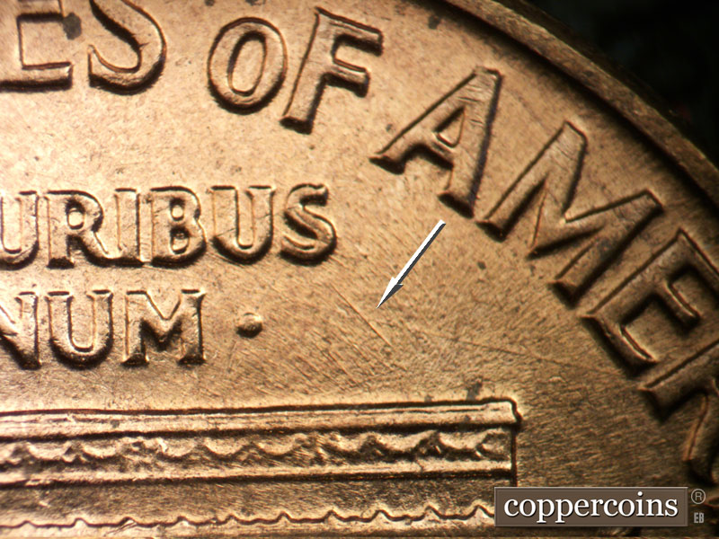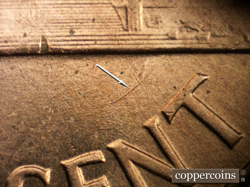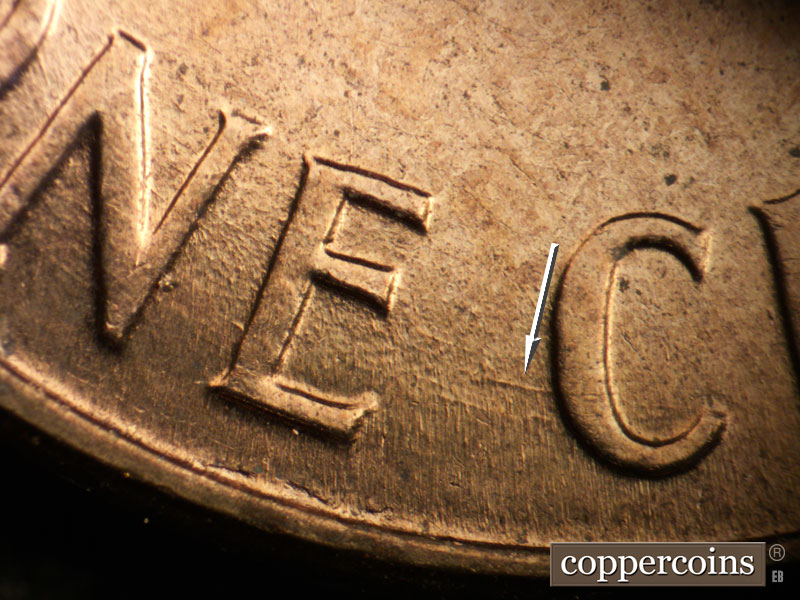 Die scratches form and X near S in PLURIBUS. Concentric die scratch above NT in CENT. Short concentric scratch from back of C in CENT