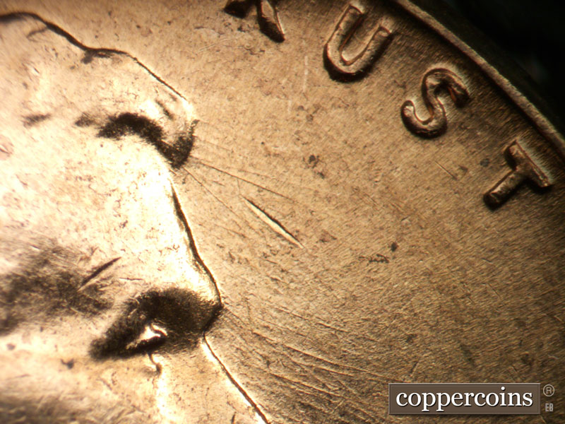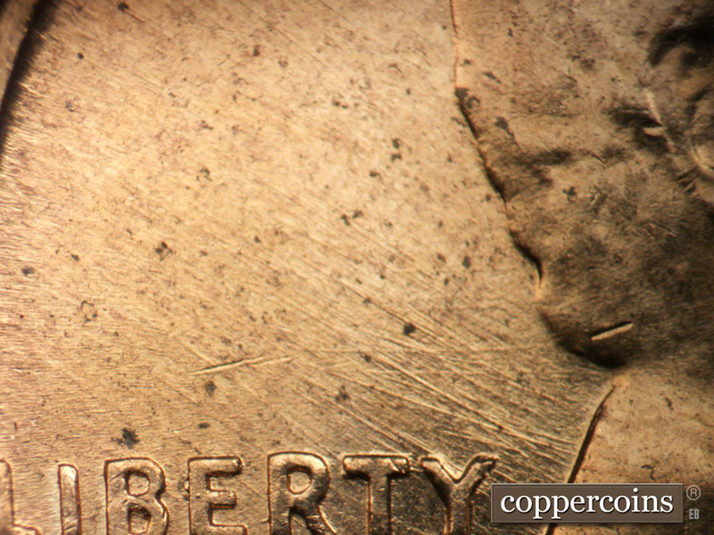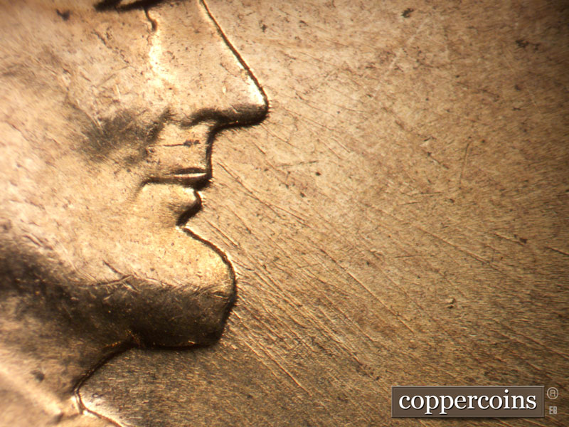 Heavy SE die scratch between date and lapel. Generally SE/NW die scratches cover most of obverse, See photos for exact configuration. Reverse is MDS