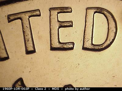 A die scratch shows in the front of the bust beneath the date. NW-SE die scratches show on the shoulder. A die gouge shows between the S and T of TRUST. A die gouge shows on the right side of the Y of LIBERTY.