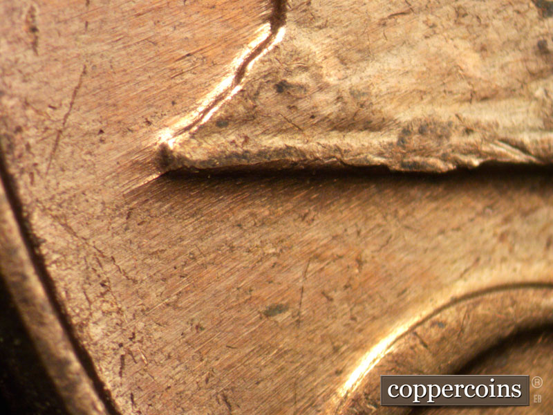 A die crack runs the length of column 12. An old die scratch runs NW - SE from above the U and through the RI of PLURIBUS and down to the M in UNUM. Die cracks on columns 1 and 2. A small NE - SW die gouge can be found in the field just to the left of the roof. A die gouge runs N-S between the M and E of AMERICA.