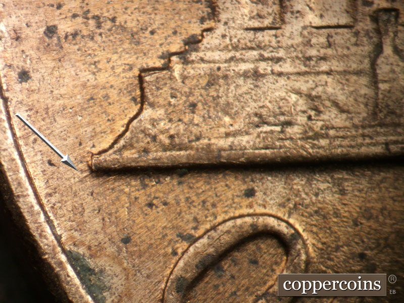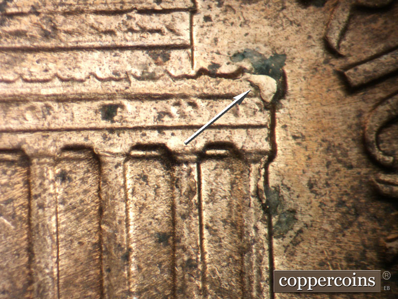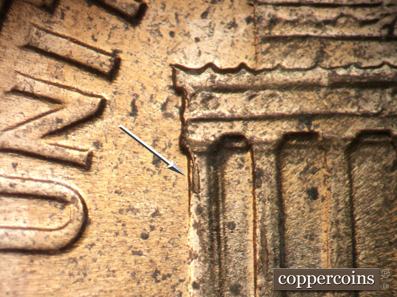 Die cracks and chips on both cornices. Die cracks on columns 1, 2, 11, and 12. Small SW die scratch from tip of left base.