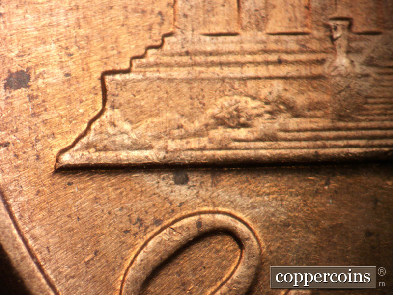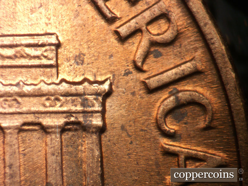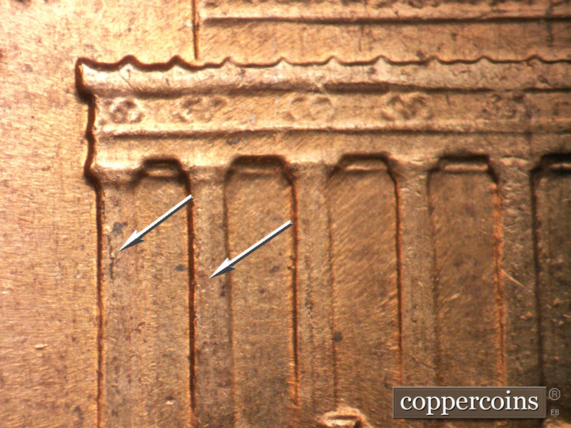 A die crack shows between the lower E and D of UNITED. Die cracks show on columns 1 and 12, and the lower left base of the memorial. Die cracks extend to the upper right roof of the building. A die chip shows inside the lower S of PLURIBUS.