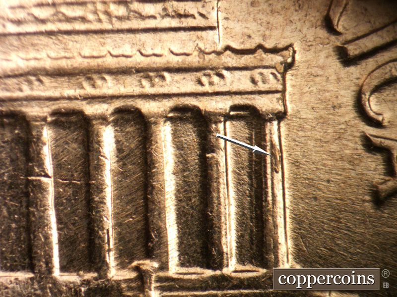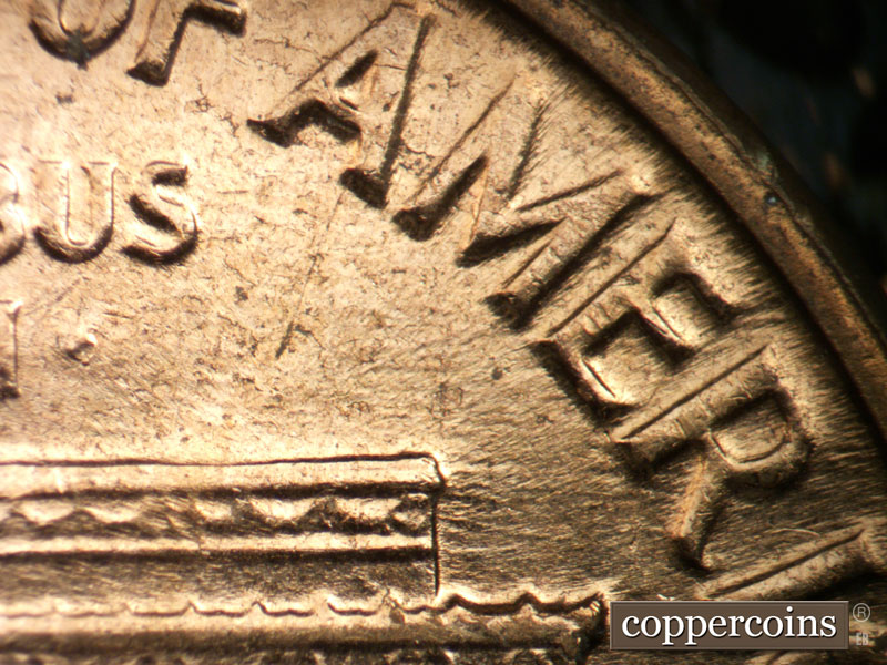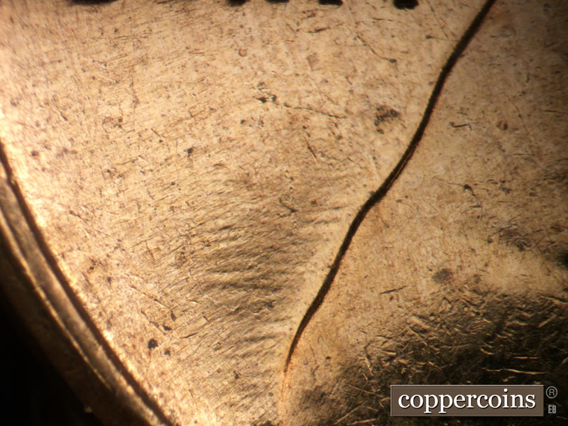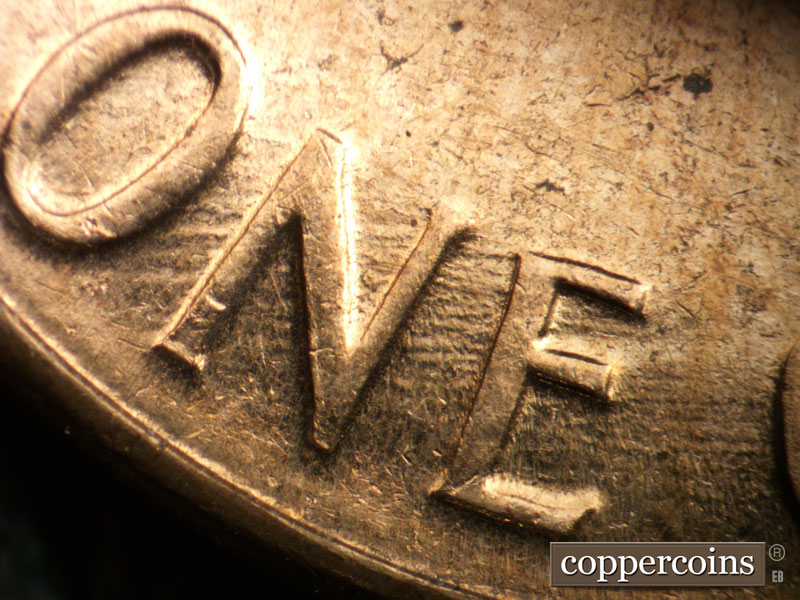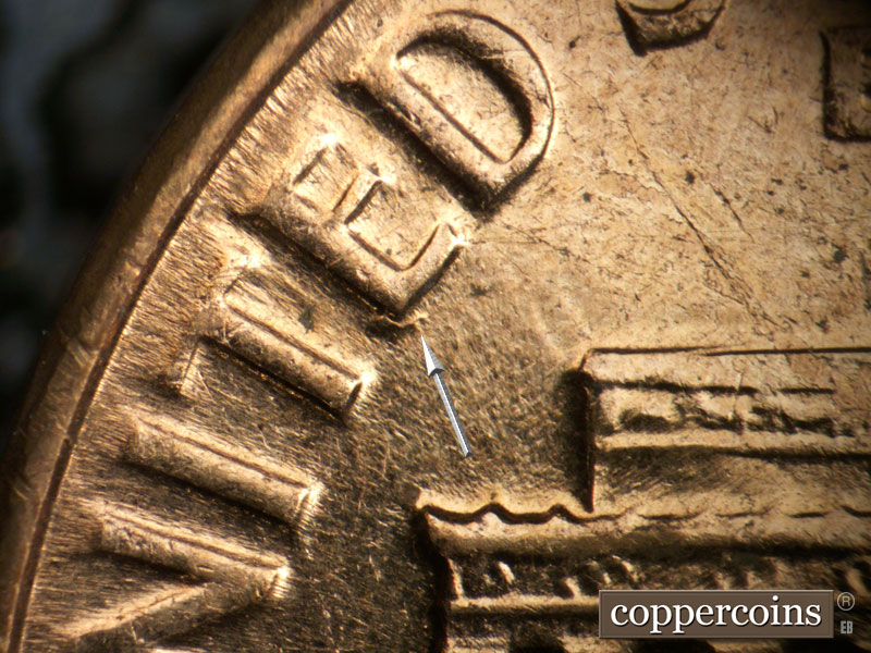 Die crack near E in UNITED. Die chip on column 12. Worn E/W die scratches through ONE.