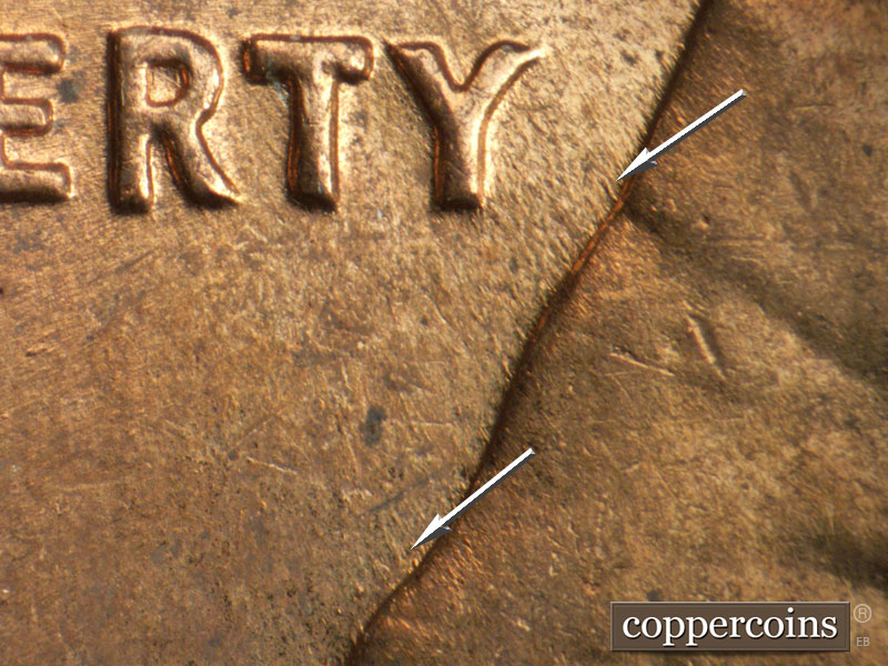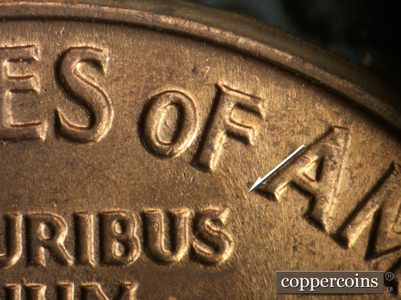 Small die gouge near first A in AMERICA. Worn generally E/W die scratches from E ijn ONE through C in CENT.
