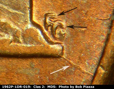 N-S die scratches in the memorial bays. A heavy die gouge runs SW from the I in PLURIBUS to the UNU of UNUM.