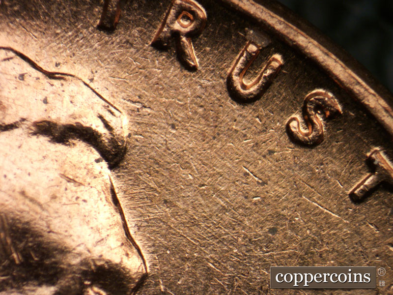 A small die scratch protrudes north from the tail of the 9 of the date. NE die scratches through RTY in LIBERTY. NE die scratches behind head. Crossing die scratches under TRUST. E/W die scratches from nose. Crossing die scratches under beard to date. Reverse is MDS