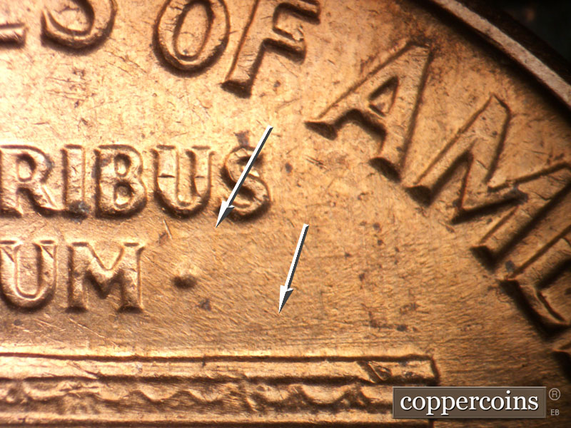 Light E/W die scratches above right roof under UNUM. E/W die scratch in O of ONE.