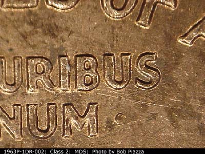 A series of stron die scratches run SE from the bottom of the IBUS of PLURIBUS. A die scratch runs SE below the first S of STATES, while other E-W die scratches run through STATES.