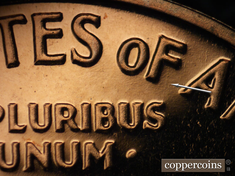 A die scratch between the F of OF and the S of PLURIBUS. Die dot on column 12