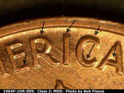A die scratch from the top of the Y in LIBERTY to the back of the head. A short, strong die scratch runs NE from the area just below the bow tie. Obverse is MDS. Reverse