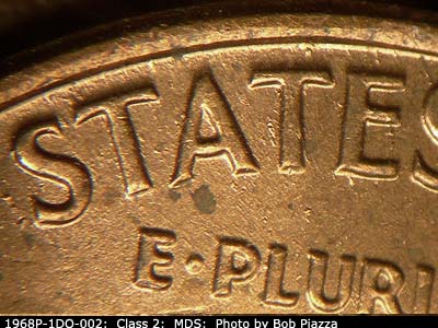 A die crack shows over VDB. Die chips over the E of WE and the first T of TRUST. NOTE: The example shown shows mechanical doubling on IN GOD. This obliterates the doubling normally shown in this area.