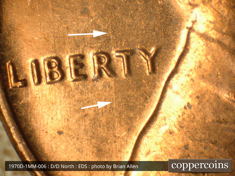 Short die gouge to upper left roof, die polish lines under E. PLURIBUS UNUM