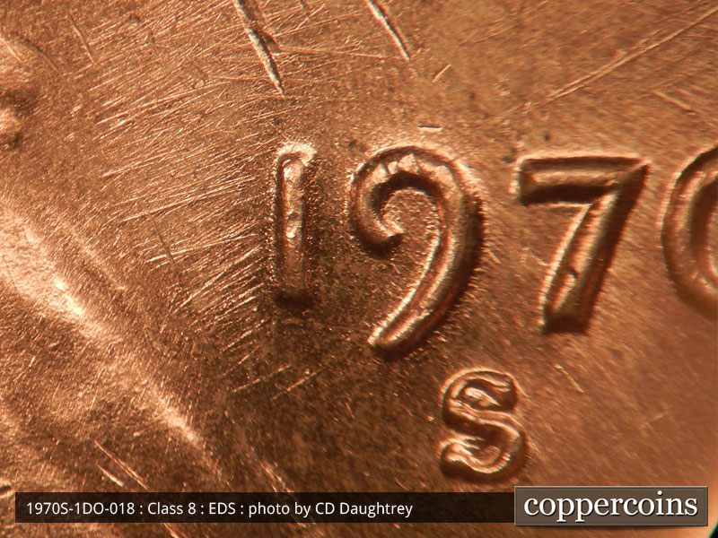 A large number of heavy die scratches show all over the obverse. Date and mintmark are shown for mintmark placement verification.