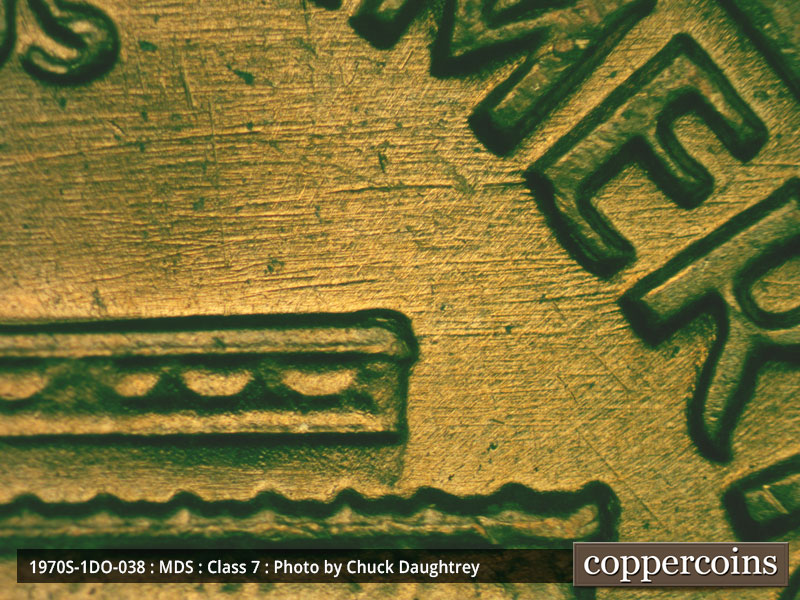 Die clash though left cornice. E/W die scratching from ITED of UNITED through E PLURIBUS to AMER of AMERICA. Pair of heavy die scratches through CA of AMERICA. E/W die scratches fro E of ONE through CENT.