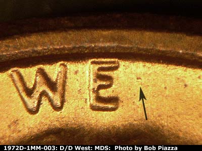 A die gouge (dot) shows to the right of the E in WE. A remnant of an old die clash shows to the left of the 1 of the date.