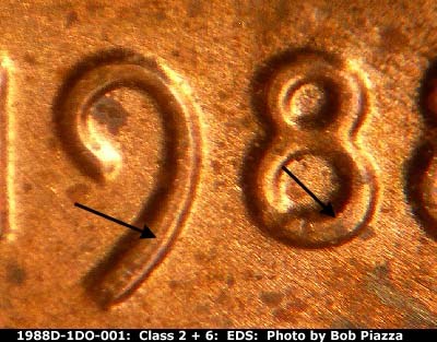 Light extra thickness shows on the 988 of the date. In addition, separation lines shows on the tail of the 9 and the bottom loops of the 8's on earlier die state examples.