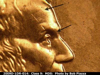A die crack on the forehead to the bridge of the nose. Obverse is EMDS. Reverse