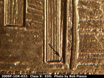 Parallel die scratches protrude from the center bar of the E in UNITED. A small die chi in the lower right corner of the door frame.