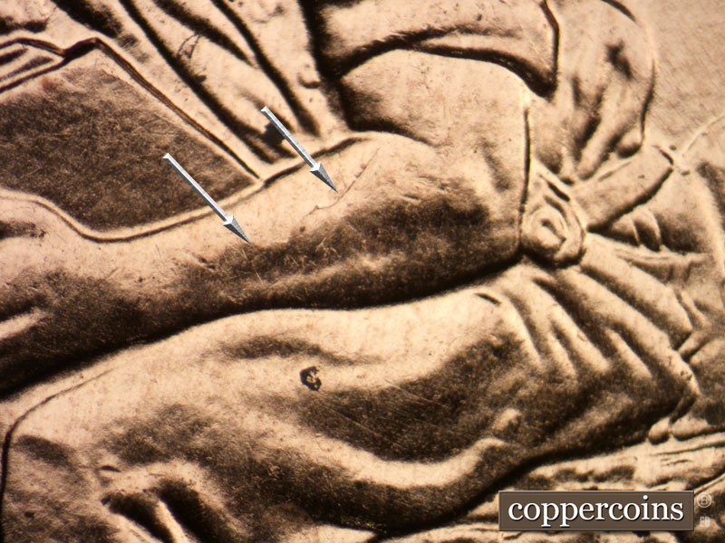 A die crack on left arm. A die crack along the bottom of right boot. Die crack on left boot. A die chip and crack in the end of the log. A die crack through the O of ONE. Numerous NE-SW die scratches in the field above the book.