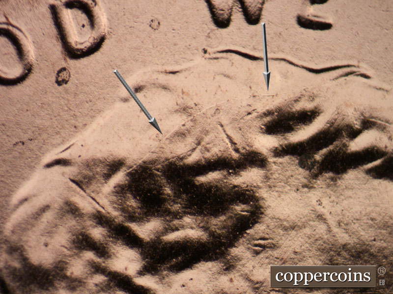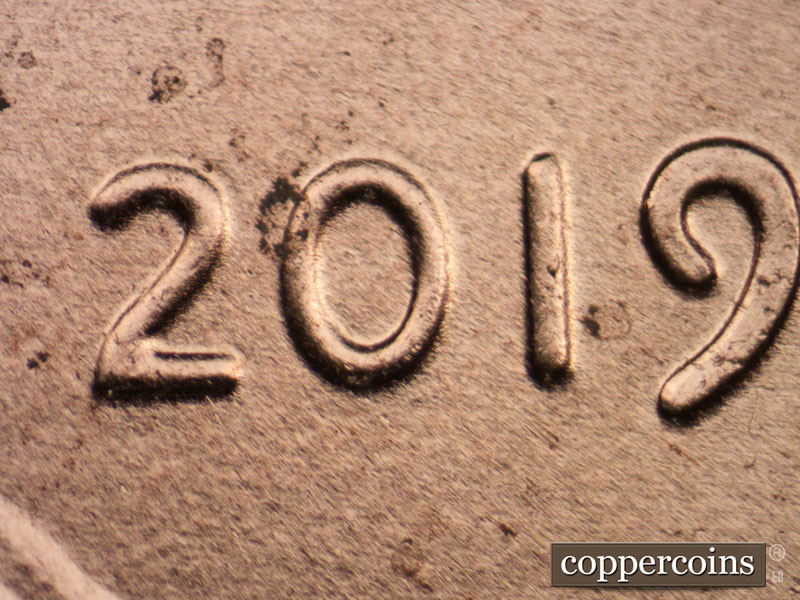 A die dot shows above the 9 of the date. A network of die cracks shows in the hair.