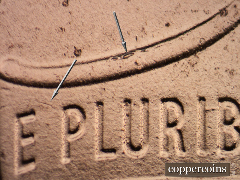 Die chip in upper left shield. Die crack or gouge from top of P in PLURIBUS